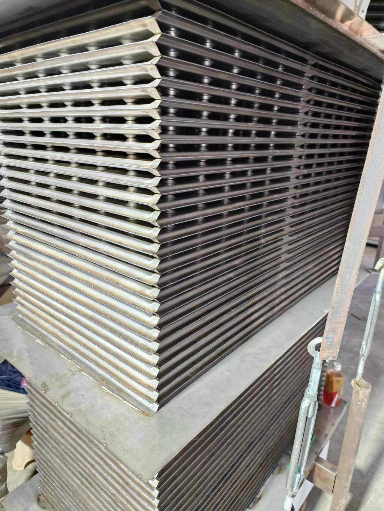 ◆由一系列平行并压有定距支撑柱的薄金属片叠装焊接而成。主要由传热板,外框密封板,压紧装置等部件组成。